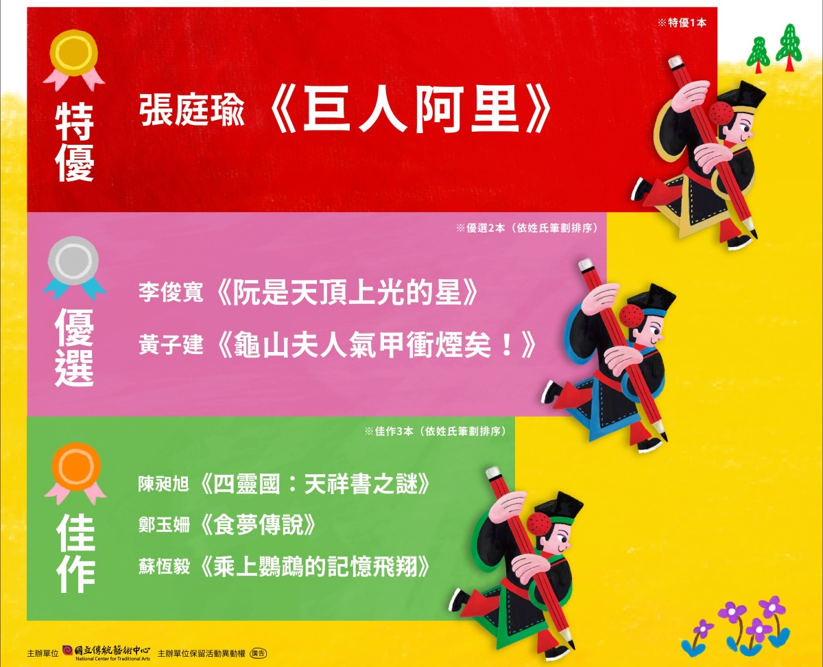傳統布袋戲持續開拓新題材、翻轉面貌,積極走進兒童的想像世界;國立傳統藝術中心自去年開始推動「兒童布袋戲劇本創作徵選」,今年邁入第2屆,吸引25件投稿作品,經過兩階段專業評審激烈討論,最終選出特優、優選及佳作共6本優秀作品。其中,由長年參與布袋戲製作並持續耕耘劇本創作的張庭瑜,以作品《巨人阿里》勇奪特優首獎,翻轉原住民的傳說故事,以溫情又富有童趣的故事脫穎而出。