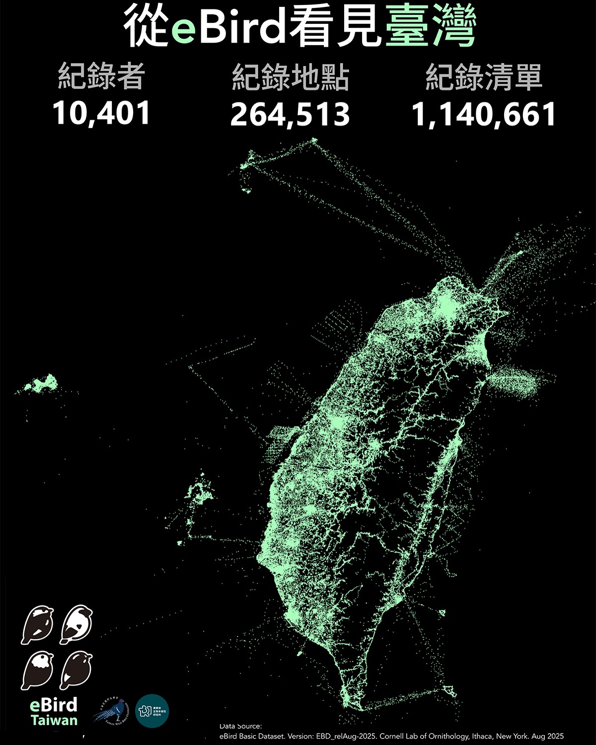 eBird是全球最大的賞鳥紀錄資料庫,提供賞鳥愛好者一個分享與管理個人鳥類觀察紀錄的管道。至今全球有超過118萬位使用者,貢獻超過1.1億紀錄清單、17億筆的出現紀錄,運用大量數據的科學研究、教育與保育案例更是不計其數。經過5年洽談及困難排除,eBird Taiwan終於在2015年8月上線,將臺灣帶入這個全球性的公民科學網絡。10年來,透過積極的推廣、工具的推陳出新,關鍵歷史資料的整合, eBird Taiwan 的使用人數已於今年6月突破萬人,目前累積138萬份紀錄清單、1,750萬筆紀錄。