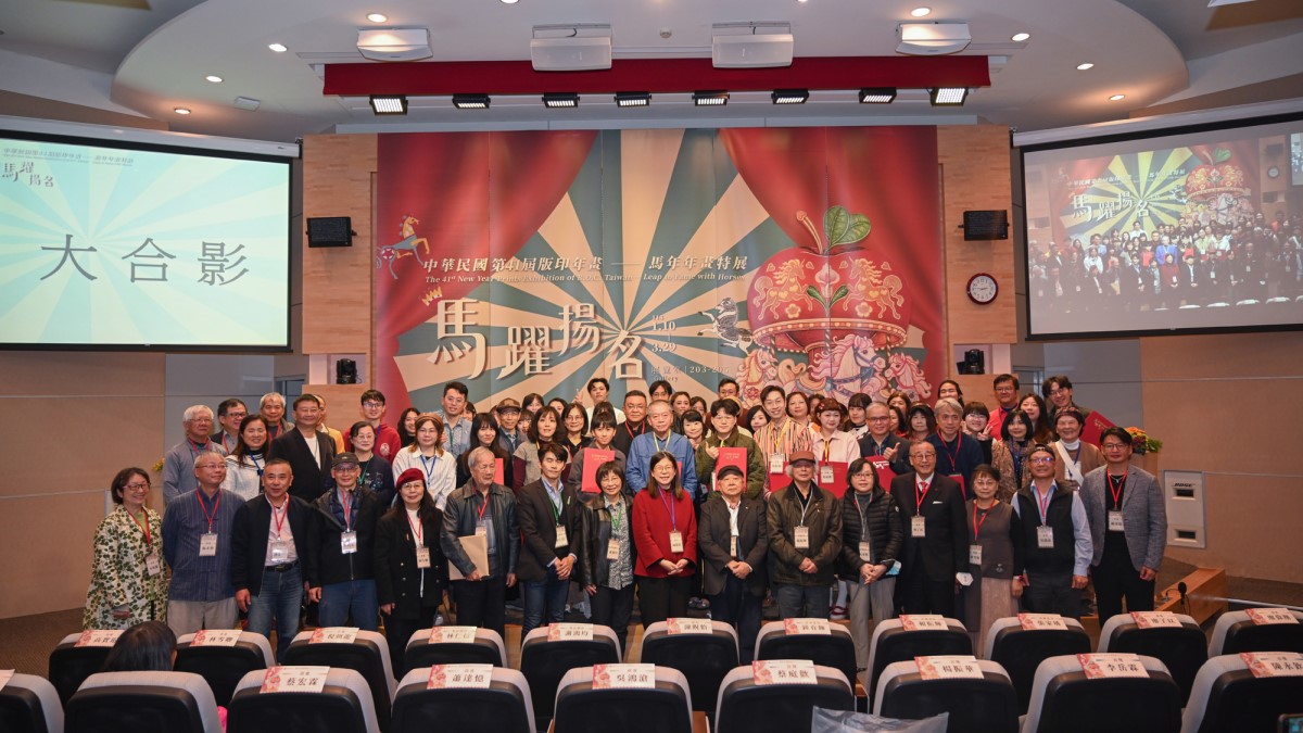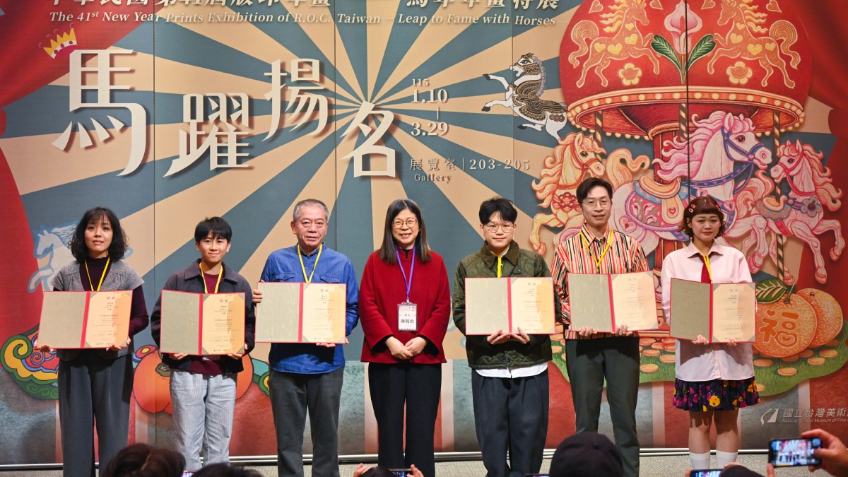 國立臺灣美術館即日起展出中華民國第41屆版印年畫「馬躍揚名–馬年年畫特展」,展出2件委託創作以及88件首獎、優選、佳作及入選作品。今(11)日辦理頒獎典禮暨開幕式,由國美館長陳貺怡主持,評審委員鐘有輝、賴振輝、張家瑀;委託創作藝術家林仁信、謝鴻均;以及所有得獎者等皆出席盛會。