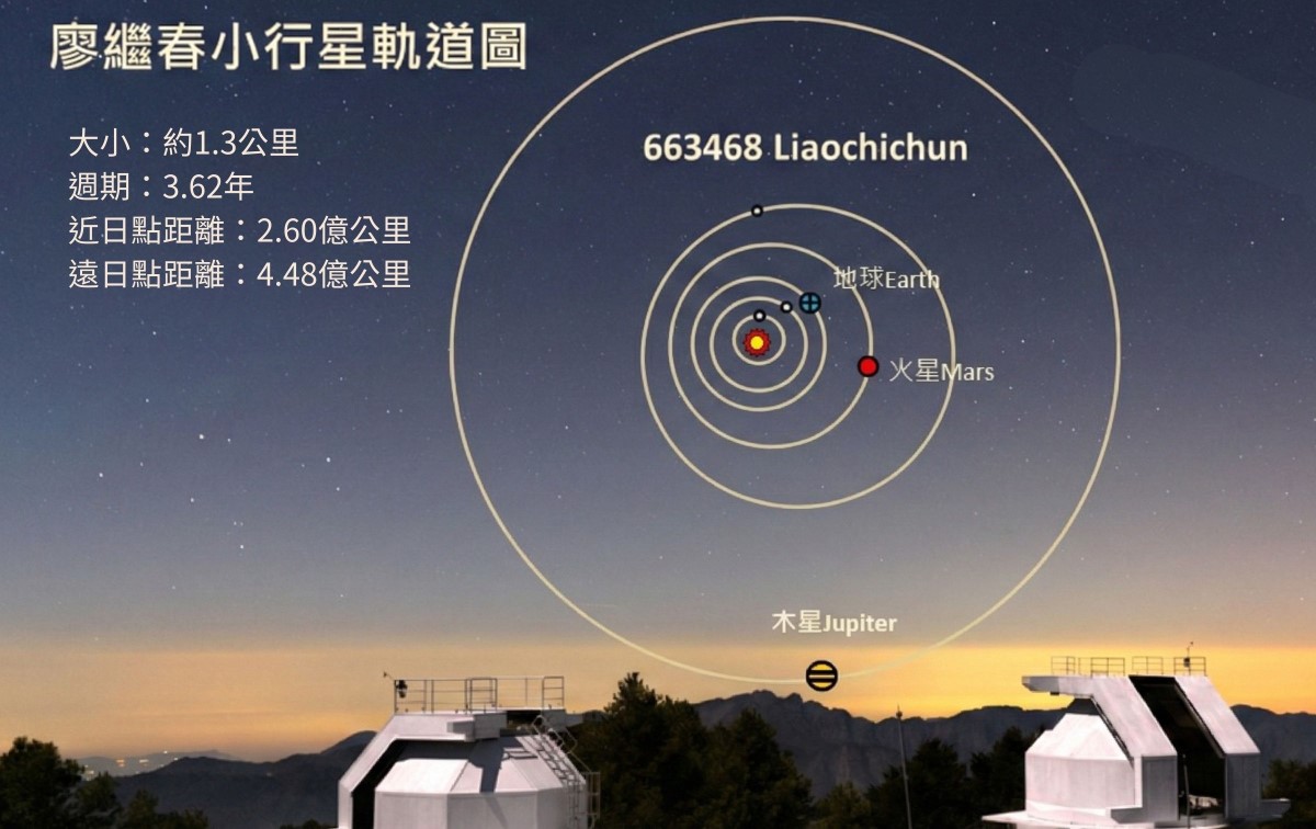 廖繼春小行星,編號663468,由中央大學鹿林天文台林啟生及美國馬里蘭大學的葉泉志博士共同發現,大小約1.3公里。這顆小行星運行於火星與木星之間的小行星帶,繞行太陽一圈約需3.62年(軌道週期),離太陽最近時(近日點)為2.6億公里,最遠時(遠日點)為4.48億公里。它在太空靜靜運行,如同廖繼春生前低調溫厚,卻能在藝術上發光發熱,持續在宇宙散發著獨特的光芒。