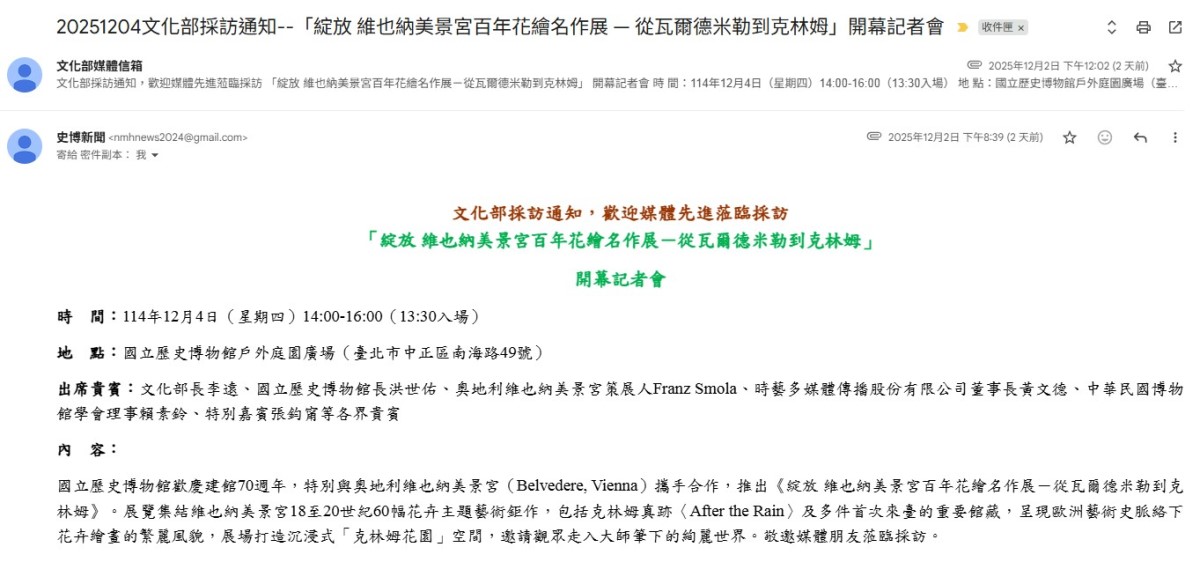 時藝多媒體自稱成立20多年,是台灣藝文展演領航者,近年藝術經濟蓬勃發展,又與聯合數位文創競爭,幾乎走向在藝文領域標餐飲為重點的生存模式,今(4)日好不容易主辦一檔與國立歷史博物館合作的「綻放 維也納美景宮百年花繪名作展-從瓦爾德米勒到克林姆」開幕記者會,接待媒體的人員卻態度傲慢,把媒體採訪人員私下分等級。
