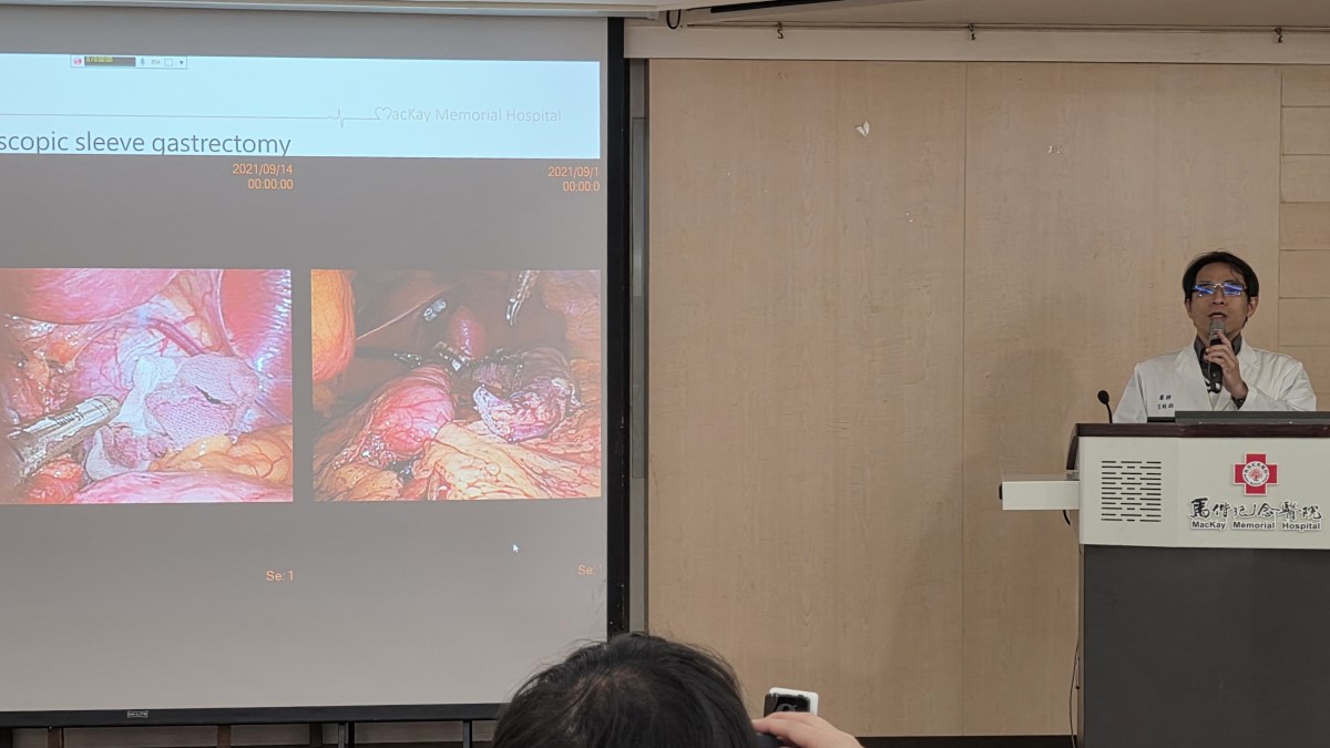 | 馬偕醫院一般外科主治醫師王柏鈞說明袖狀胃切除術為典型的限制型微創縮胃手術。(歸鴻亭攝影) |