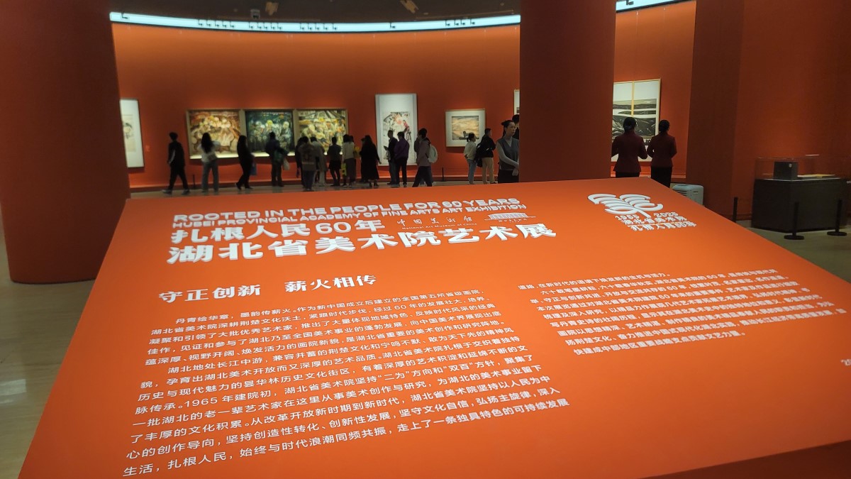 該館主展廳目前正展出《紮根人民60年—湖北省美術院藝術展》,這是中國建立的第5所省級畫院,展現「建院60年來的重要事件、藝術家及作品進行細緻梳理及深入研究,彰顯新時代畫院以思想精深、藝術精湛、製作精良的美術精品」,撇開兩岸政治因素,純以文化藝術角度視之,這個地方省籍的展覽推出的作品仍以傳統水墨畫為主。