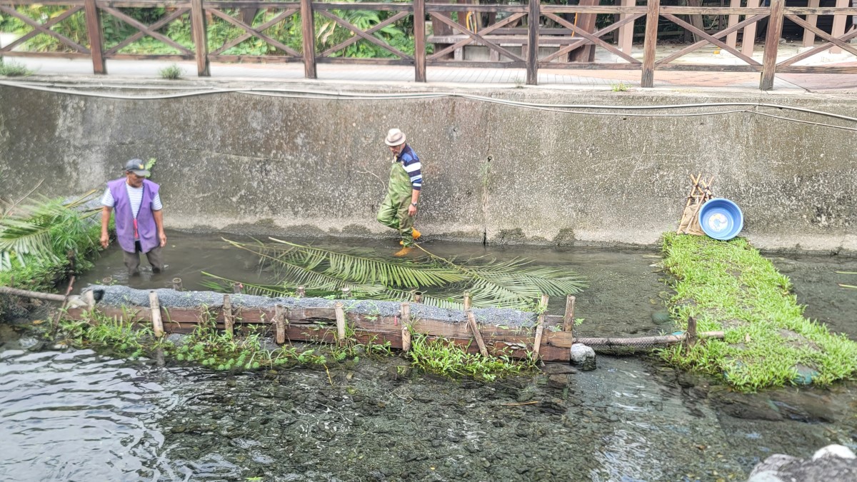 | 阿美族人製作出竹筒、樹枝、雜草3層的「魚屋」。(歸鴻亭攝影) |