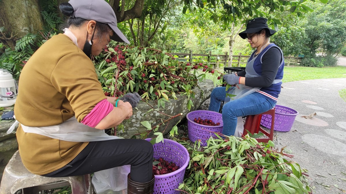 | 欣綠農園員工整理採摘回來的洛神花。(歸鴻亭攝影) |