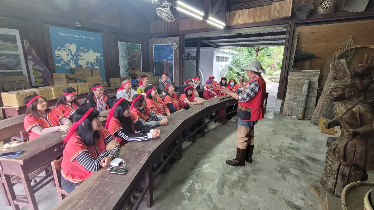 | 蔡義昌與穿著阿美族服飾遊客說明母系社會特質。(歸鴻亭攝影) |
