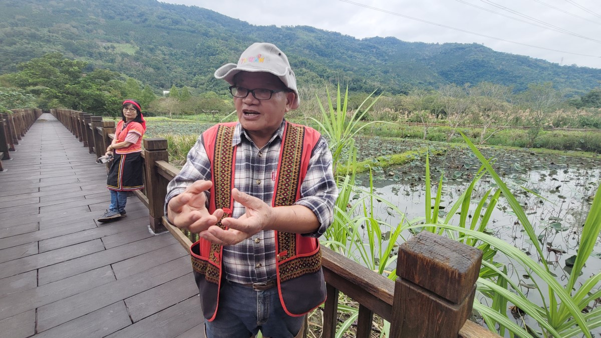 他對總面積約12公頃的馬太鞍濕地更是如數家珍,帶領穿著阿美族服飾遊客走在生態園區木棧步道上,首先說明淤泥中已經開始枯萎的一大片葉子是蓮花還是荷花?他頭頭是道介紹兩者的不同,但偷翻手機查了Google,兩者是同一種植物,差別在於荷花泛指花、葉總稱整個植物,而蓮花則特指其果實蓮子。