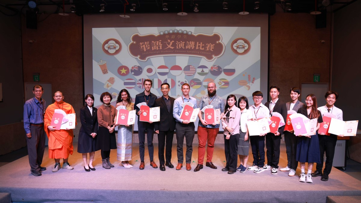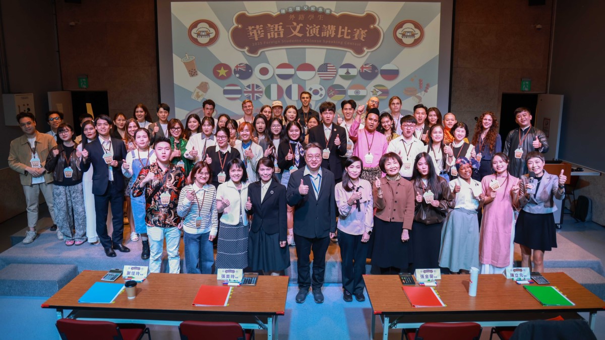 「2025年外籍學生華語文演講比賽」參賽者合影。(歸鴻亭攝影)