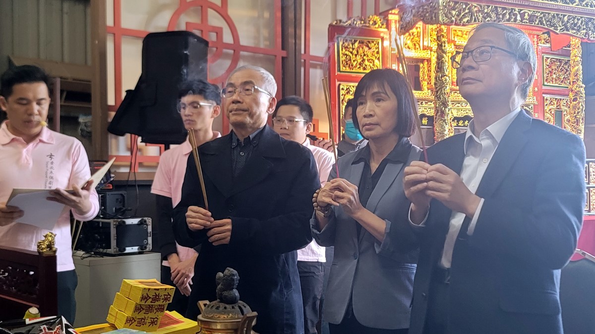 | 自左至右為文資局局長陳濟民、傳藝中心主任陳悅宜與李遠敬拜送神儀式。(歸鴻亭攝影) |