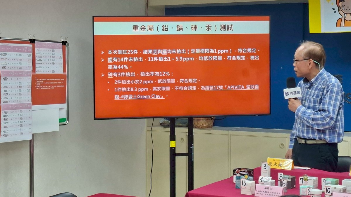 本次調查市售泥膜在標示符合率約為92%,多數業者能依據《化粧品衛生安全管理法》詳實標示品名、用途、全成分及批號等資訊。然而,仍有少數品牌如編號15與24號因全成分被貼標遮蓋或完全缺乏中文標示而違規,這不僅削弱了消費者的知情權,亦可能隱藏成分過敏風險。在安全性檢測方面,由於泥膜的主要原料採自天然地層,礦物成分極易自然殘留地質中的微量元素,因此原料純度與重金屬管控成為本次調查測試的核心動機。測試結果顯示,雖汞與鎘均未檢出,且鉛含量也符合標準,但仍有1件樣品砷含量超過法規限量,恐會引發長期使用的健康風險疑慮。