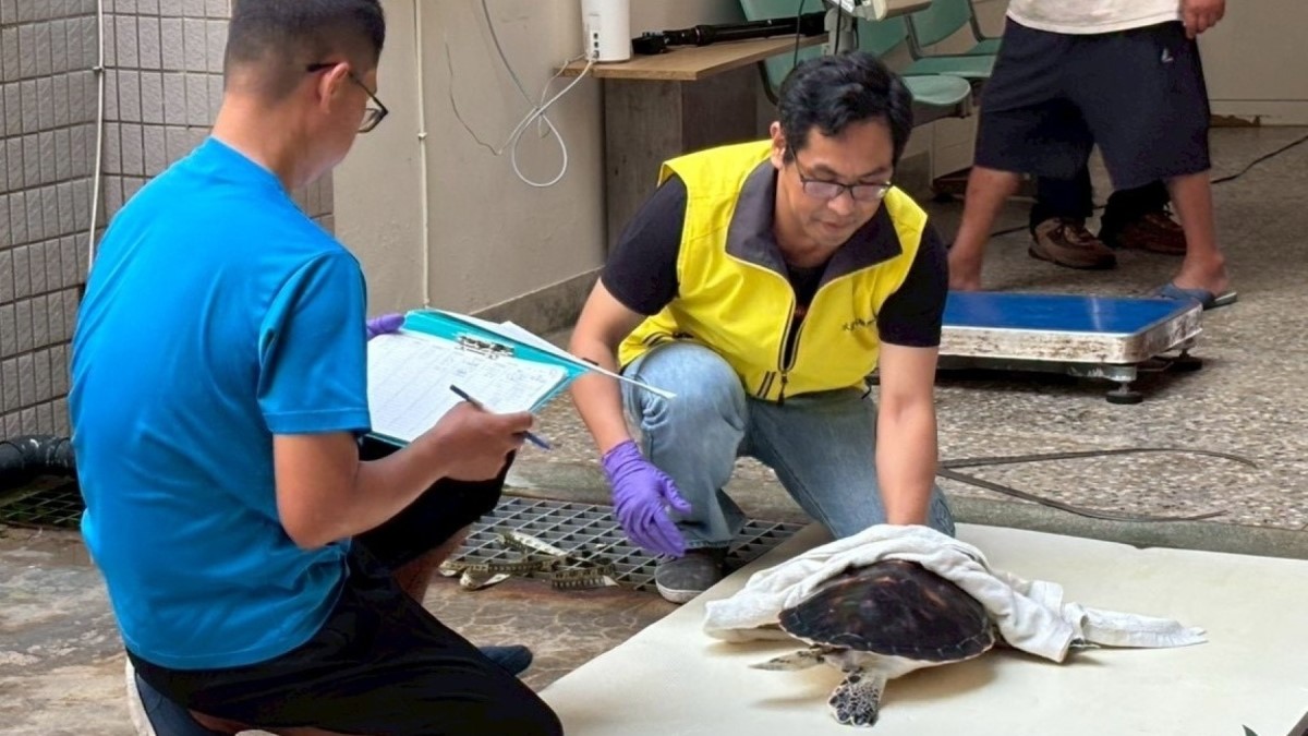 澎湖縣望安國中實際走訪望安綠蠵龜保育中心,中心人員進行海龜檢查。(教育部國教署提供)